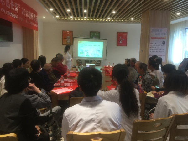 参加活动的同学们在康复学系老师指导下运用所学的知识,以PPT讲座、现场演示和游戏互动等形式,为长者开展如何保护膝关节的宣教活动,普及如何保护膝关节的科学知识与技能。在讲座的过程中,同学们一对一地教老人学会膝关节保护操,并鼓励老人们去体验“老摇滚”身心机能活化系统,裴老师现场教老人们感受老人摇滚单车、体验健身快乐。同时还贴心地给老人们准备了纪念小礼品。