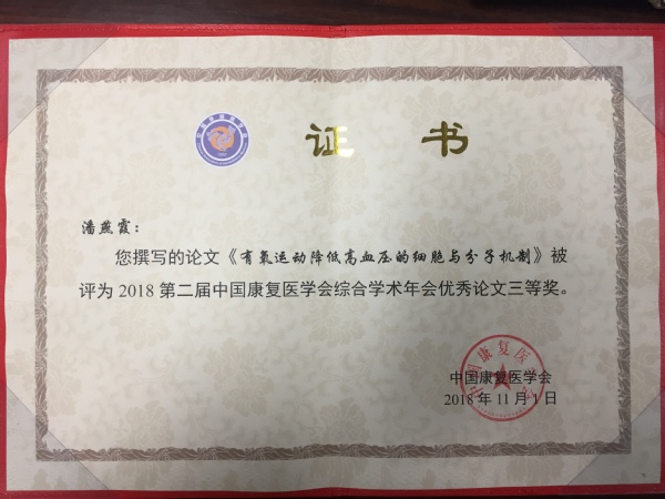 国康复医学会第二届综合学术年会于2018年11月16—18日在北京举行,william威廉英国官网康复治疗学系共有3名教师荣登2018年度中国康复医学会风采榜。倪国新教授被评为2018年度优秀康复医师;梁杰老师被评为优秀青年康复医师;潘燕霞教授的《有氧运动降低高血压的细胞与分子机制》被评为优秀论文三等奖,并在会议期间进行壁报展示。(康复治疗学系 许桂清)