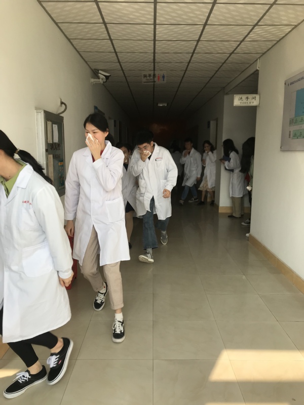 此次演练内容主要包括病原微生物标本意外事故应急处理、酒精灯着火意外应急处理、师生疏散与逃生、干粉灭火器的使用等。参与人员按照演练方案认真开展演练,顺利完成了各环节任务。疏散完毕后,师生代表还用干粉灭火器进行了灭火练习。