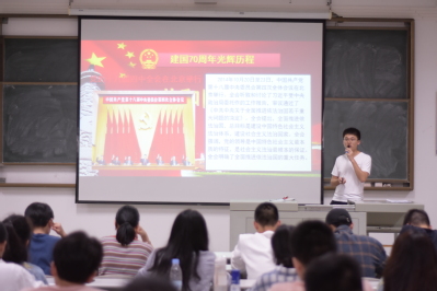 活动中,党员刘伟同志用大家耳熟能详的红歌作为此次活动的切入点,为参与活动的同学们介绍了中华人民共和国成立前不同历史阶段的红歌产生和演变过程,带领大家学习了新民主主义革命、社会主义革命和改革开放新时期三个时期的历史,重温了中国共产党领导中国人民在建国70年以来的辉煌成就。大家还一起学习、探讨了中国特色社会主义新时代的思想内涵。