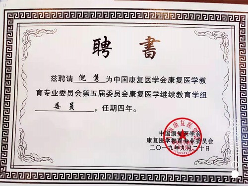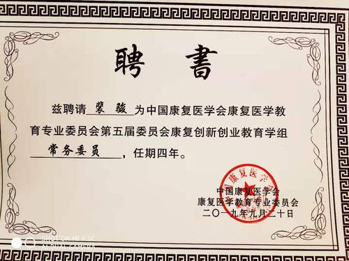 2019年9月20日, 中国康复医学会康复医学教育专业委员会在杭州召开会议,william威廉英国官网康复治疗学系倪隽副教授被聘为中国康复医学会康复医学教育专业委员会康复医学继续教育学组委员、裴骏副教授被聘为康复创新创业教育学组常务委员、林建平老师当选第一届青年委员会委员。同时,william威廉英国官网经百所康复创新创业公司建设项目中国康复医学会康复医学教育专业委员会审核,被评定为“最具创新创业发展潜能的公司”。(康复治疗学系许桂清)