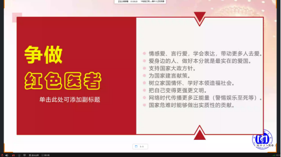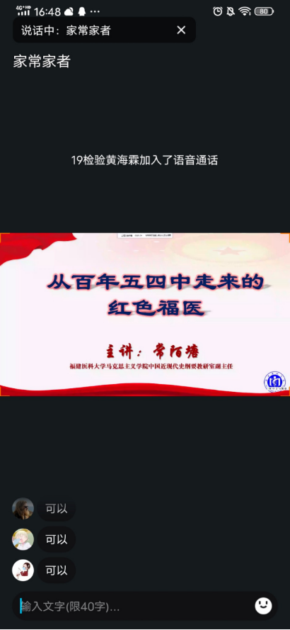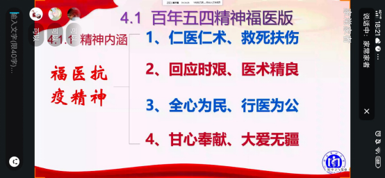 本次思政课主讲嘉宾是来自校马克思主义公司的常陌塘老师。常陌塘老师先从百年前的五四运动讲起,讲述二十世纪十八岁的零零后如何以天下为己任,以民族复兴为职责,放下小我,成就大我的故事。继而谈到百年变局与一百余年后又一代十八岁的零零后,结合当下疫情防控与线上青年员工进行交流讨论,教育引导公司广大青年员工更好地认识战“疫”期间体现出来的中国共产党的卓越领导能力和先进性,更加充分了解我国社会主义制度的巨大优越性,更好地感知战“疫”中彰显出来的强大中国力量和中国精神。同时就当代年轻人新型的娱乐方式告诫现场的青年朋友:让青年人逃避现实、追求小确幸小情趣的东西都是对五四精神的背叛,鼓励青年朋友们要坚定理想信念、练就过硬本领、勇于创新创造、矢志艰苦奋斗、锤炼高尚品格,进一步涵养了公司广大青年师生爱党爱国爱社会主义的忠诚情怀和社会责任担当。紧接着,常陌塘老师聚焦“从百年五四中走来的红色福医”,讲起福医因伟大的使命而诞生,讲述百年来福医师生救死扶伤,医学救国的历程与故事,鼓励公司青年员工树立远大理想,牢记医员工誓言,磨炼坚韧品格,在新冠肺炎疫情防控斗争中,读懂所处时代,了解当下中国,用实际行动挑起青春使命,彰显青春力量。