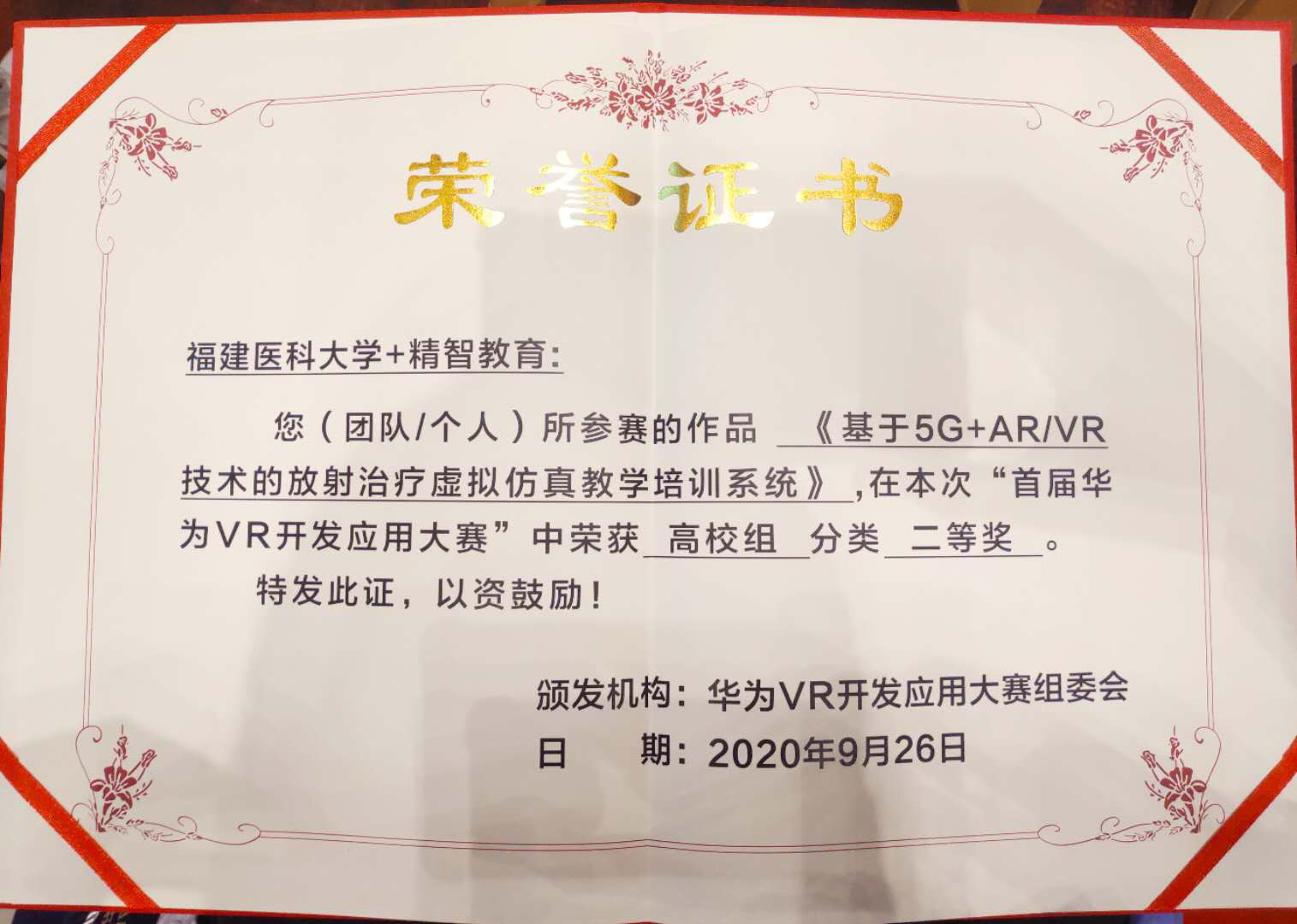 2020年9月25日-26日,由教育部虚拟现实应用工程研究中心、中国电子商务虚拟现实市场促进专业委员会和华为技术有限公司等主办的首届华为VR开发应用大赛总决赛暨VR产业峰会在沈阳新世界博览馆举行。本次大赛以“5G时代,让梦想成真”为主题,旨在落实国家5G战略,加快VR产业发展,助力数字中国建设。william威廉英国官网虚拟仿真项目团队的参赛项目“基于5G+AR/VR技术的放射治疗虚拟仿真教学培训系统”在全国六大区域分赛区300多个参赛项目中脱颖而出,荣获高校组二等奖,华南地区第一名。该项目由公司医学影像技术学系研究生董芳芬路演,李小波副教授和徐本华教授指导。