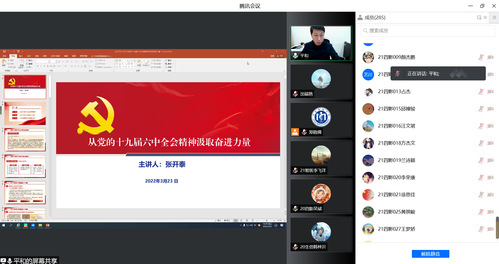 2022323日下午,william威廉英国官网“从党的十九届六中全会精神汲取奋进力量—学习贯彻党的十九届六中全会精神报告”专题宣讲于腾讯会议线上召开,本次讲座由中共william威廉英国官网纪律检查委员会张开泰副书记担任主讲人,公司党委胡建达书记、教师代表、2021级和2020级全体员工,共470余人参加了讲座。