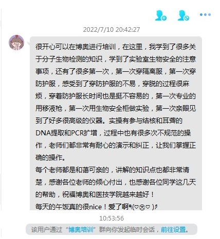 此次培训是校内课堂教学的有效补充和提升,是充分发挥教学实践基地作用,进行深度校企合作,探索多主体育人模式,提升人才培养质量的一次有益探索。通过此次培训,搭建并实化了校企合作平台,为同学们走出校园、切身感悟检验全产业链新技术、新发展提供了难得的学习机会,不仅强化了同学们的专业知识和实践技能;更新了同学们的就业观念,助力构建多元化就业格局;也进一步激发了同学们对医学检验的专业热忱和职业担当。(医学检验系杨月月)