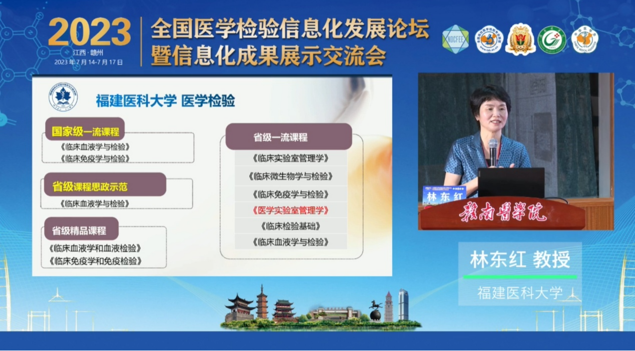 7月14日至17日,2023年全国医学检验信息化发展论坛暨信息化成果展示交流大赛在江西赣州举行。此次活动由教育部高等公司国家级实验教学示范中心联席会、全国高等医学教育医学检验专业校际协作会、全国高等公司医学检验专业联盟等主办,中华医学会检验医学分会协办。公司林东红教授受邀在本次论坛做了“医学检验技术专业课程——一流课程建设体会”主题报告,全国80多所高校医学检验技术专业的300余名师生参加了比赛。