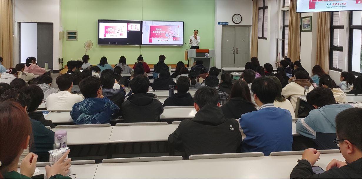为进一步落实公司“第三届实验室安全月”系列活动要求,铸牢公司师生生物安全防范意识,加强生物安全管理,2023年11月16日,公司特邀福建省立医院临床医学实验研究中心主任黄毅教授,于博学楼第10教室举办“实验室生物安全管理ABC”的生物安全专题讲座。公司连铸淡副经理、实验教学中心杨秀霖副主任、林旎副主任、公司部分研究生导师、实验室安全管理人员、全体研究生及2021级本科生等100余人参加。