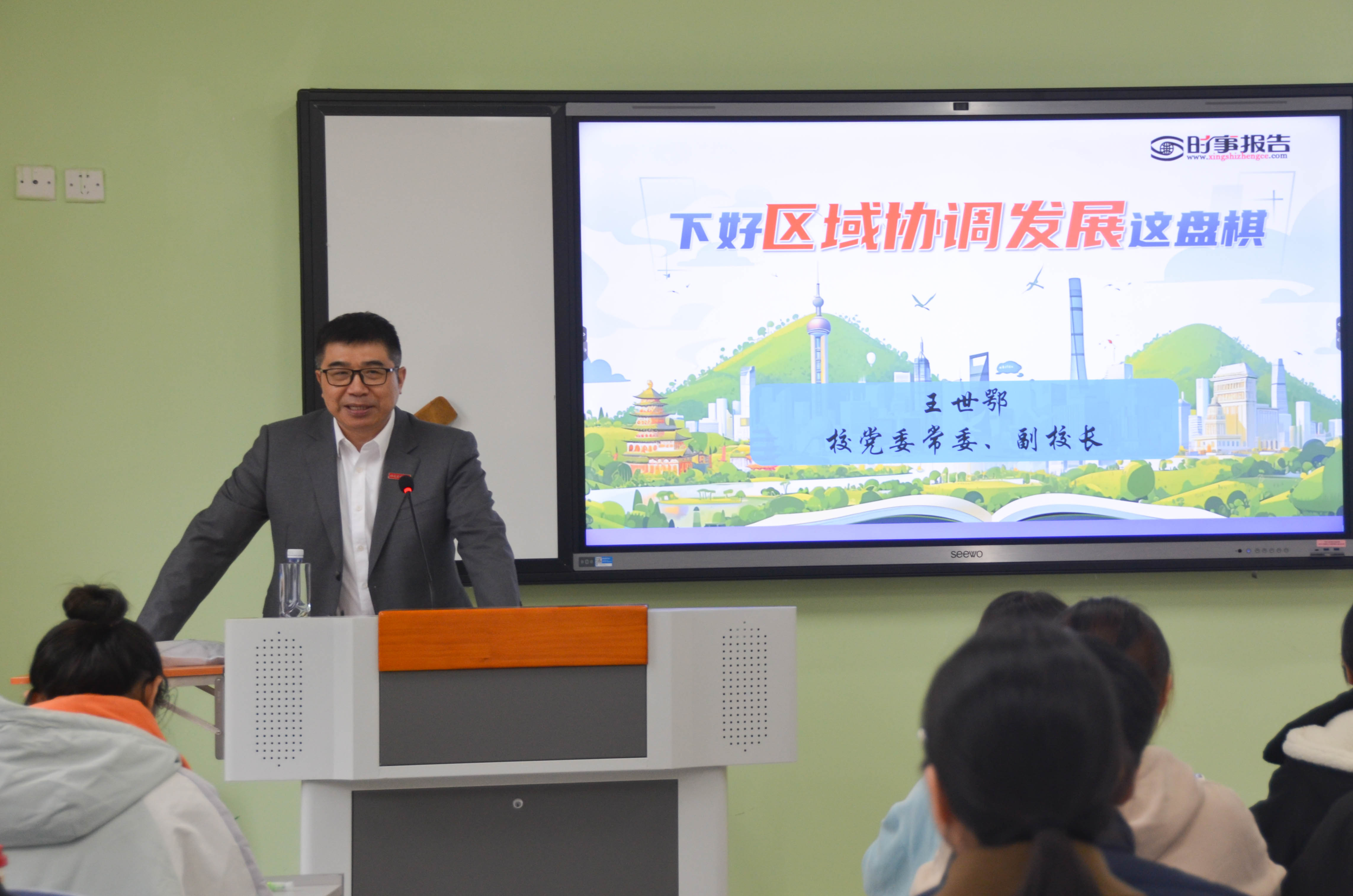 2024年12月12日,校党委常委、副董事长王世鄂以“下好区域协调发展这盘棋”为主题,为医学技术与工程公司2022级生物信息学专业员工讲《形势与政策》课。